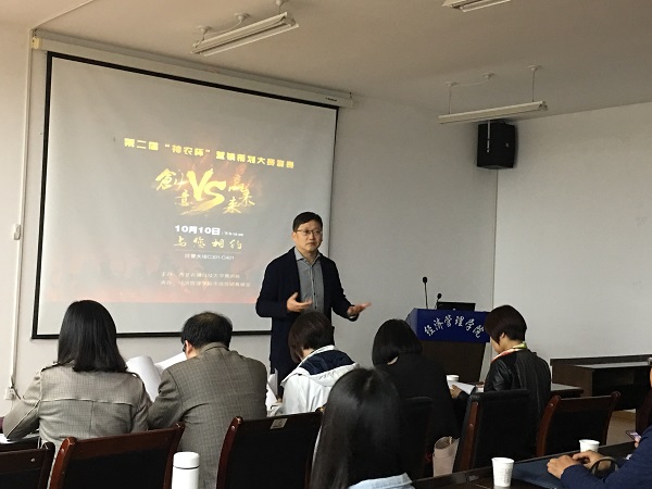 10月10日晚19:00,我校“一院一品”学科竞赛、第二届“神农杯”营销策划大赛复赛在黄金城官方网站C301、C401分两个会场顺利举行。此次比赛由我院市场营销教研室承办,以“创意赢未来”为主题。组委会收到了来自9个学院64个团队257名选手的参赛申请,经过第一轮通讯赛,共有20支团队脱颖晋级复赛。大赛邀请了管理系主任刘超副教授,经济系主任王秀娟副教授、李桦教授等10位教师代表担任评委,200余名师生观摩比赛。