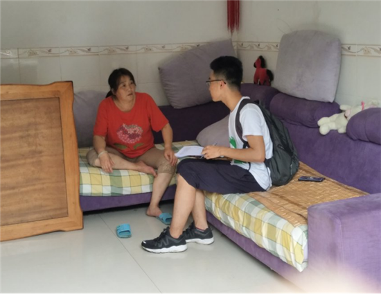 在早上九点,队员们来到了杉树村。盛夏的蜀地,天气异常炎热,再加上杉树村的入户道路均是山路,更是为队员们的调研之路增添了难度。队员们在迂回曲折的山路中走到了10点,终于找到了一位在家做农活的阿姨,了解到队员们的来意后,阿姨热情、详细的回答了队员们的问题,也耐心的填制了调查问卷。最后,她还带领队员们实地观察了杉树村的垃圾处理点。通过阿姨的描述,队员们知道了杉树村的土地流转制度并没有落实到实处,也知道了该村的养老保险制度,医疗保险制度还存在部分问题。
