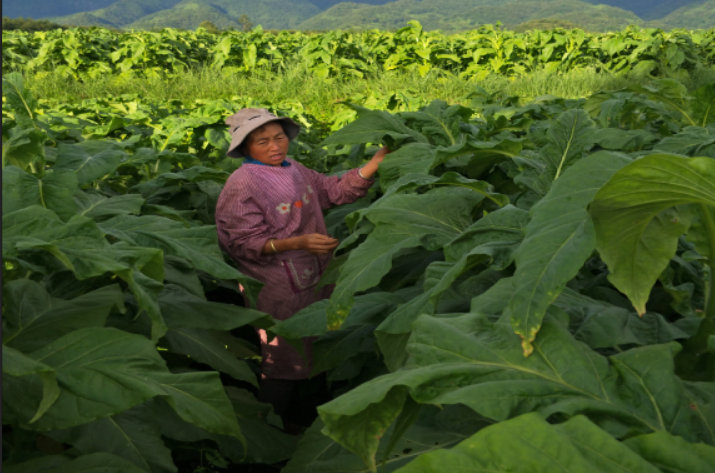 炽热的火伞高长在空中,热得河里的鱼不敢露出水面,鸟也不敢飞出山林,村中的狗也只是伸长舌头喘个不休。但村民没有躲藏在屋檐下,而是在田间奋斗着。他们每个人都被晒得黝黑,在她们的脸上我们看到了疲惫,但她们脸上都带着微笑对生活充满了希望。当调研团到达田间时,遇到一位村民正在辛勤劳作,她热情地向调研团展示田里的烟草长势,她对今年所种的烟草非常满意,并且向我们介绍种烟的流程,需要挖烟沟、种苗、撕薄膜、盖土、拴、烤、分等等步骤。我们都感叹好复杂呀!