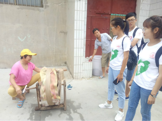 刚进村子不久,小队看到一家大爷大娘在织麻绳,他们见我们是来调研的大学生,也十分热情地招呼我们。在他们的耐心讲解下,我们才知道这个麻绳原来是嫁接牡丹用的神器。洛阳不仅是十三朝古都,而且还被誉为“牡丹之城”,而这对老夫妇就是一家牡丹专业种植户。经过了解,牡丹直接用种子播种不太容易成活,所以当地几乎所有的种植户都采用嫁接的方式,培育新品种,这种成活几率高。农户都去采摘牡丹芽子进行两个品种的嫁接,然后用麻绳将这两个枝系在一起,因为麻绳相对于塑料等其他材料,能随着时间的推移而降解,具有无污染的优点。