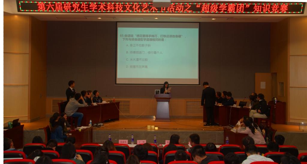 为深入贯彻落实习近平新时代中国特色社会主义思想,助推我校“双一流”建设,进一步提高学生的学术科研水平和创新实践能力,4月15日晚7时,由党委办工部、校团委主办、校研究生会组织、黄金城官方网站研究生会承办的“超级学霸团”知识竞赛在经管学院C101举行。本次知识竞赛吸引了来自我校多个学院各年级研究生、本科生100余人参加。