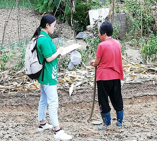 清晨,调研队来到当地民主镇与扶贫办工作人员进行交流。队员们了解到,当地扶贫办以基础建设为主体,移民新村建设为重点,扶贫攻坚有了新进展,目前全镇已建立了农田、银米、马安、德胜移民新村,当地的扶贫政策基本全方面实施,致力于实现在2020年全面脱贫。随后,望着高耸的山峰中零星坐落着房屋,队员们顺着山路深入山区询问当地农户的家庭情况。队员们耐心地询问村民基本情况、外部环境情况、生态补偿政策、种植情况和可持续生计等问题。村民们用质朴的语言表达了国家扶贫政策的优越性,扶贫办工作人员会经常深入山区调查情况帮助他们实现脱贫。