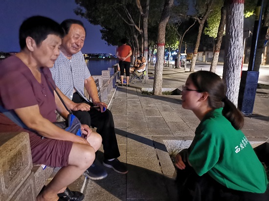 晚上,调研队来到包公祠。在包公祠外面,队员们采访了几位乘凉的老人,了解到他们对开封近几年来文化变迁的感受。老人们很高兴大学生能如此关注开封文化发展,积极接受队员们的访问调查。从其中一对受访者那里,队伍得知,最初一些文物古迹只是较破旧的小宅或者当地残留下来的一座碑,近几年,政府在原有的基础上对其进行开发利用,不仅当地的文物古迹得到了保护,进一步增强了开封的文化氛围,而且当地居民还可以通过旅游获得一定的经济收益,可谓一举两得。